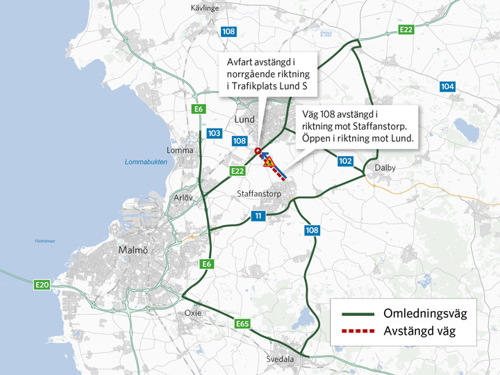 Totalavstängning väg 108 mellan Lund Södra och Staffanstorp.