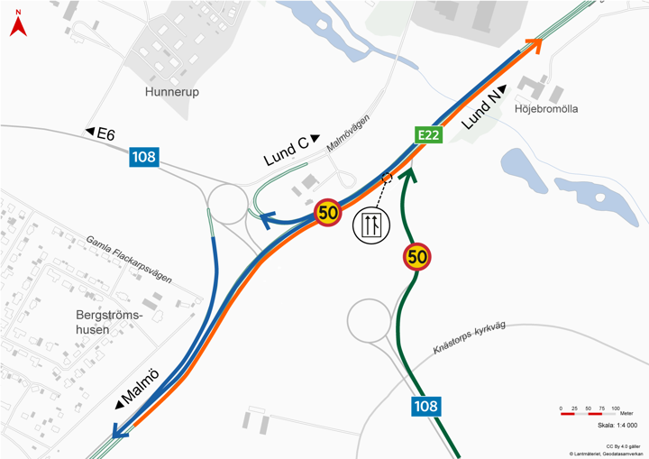 Från och med den 26:e maj kommer trafiken på E22 förskjutas till västra sidan av vägen och gå på en tillfällig förbifart vid trafikplats Lund Södra med fyra körfält öppna, se karta nedan. Förbifarten görs för att få en säker arbetsmiljö för de som arbetar och en säker trafiksituation för trafikanterna. Den innebär också att byggtiden blir kortare. Förbifarten utförs i samband med att den nya sexfältiga bron vid trafikplats Lund Södra byggs och de befintliga broarna rivs. Dessa arbeten beräknas pågå under tio månader med start maj 2025. Väg 108 kommer att vara öppen i västlig riktning mot Lund med påfart norrut på E22. Ombyggnaden av väg 108 beräknas vara klar under april 2026 och vägen öppnas då i båda riktningar.
