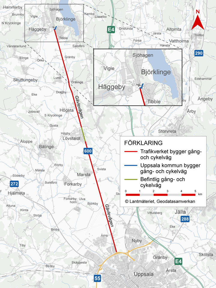 Karta över gång- och cykelväg Uppsala-Björklinge