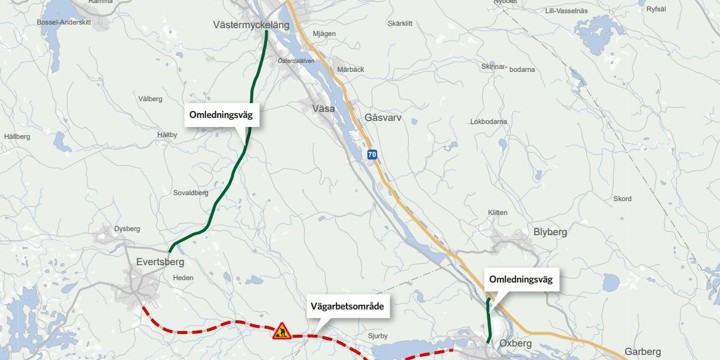 Vi är igång med arbetet på Vasaloppsvägen och från och med måndag den 11 mars kommer vi att stänga sträckan mellan Oxberg och Evertsberg. Vi leder om trafiken via Älvdalen.