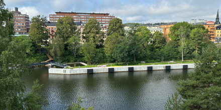 Arbetet med att bygga klart promenadvägen på västra sidan, i den norra delen av kanalen, pågår för fullt. Just nu monterar vi broarna som ska ta dig ut på Kanalholmen strax söder om Mälarbron.
