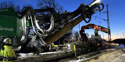Det speciella tåg som används för att borra hål för fundamenten som de nya kontaktledningsstolparna ska stå på, rullar sakta norrut. Nu har vi avverkat den första etappen, närmare 18 km lång, mellan Kville och Ytterby.