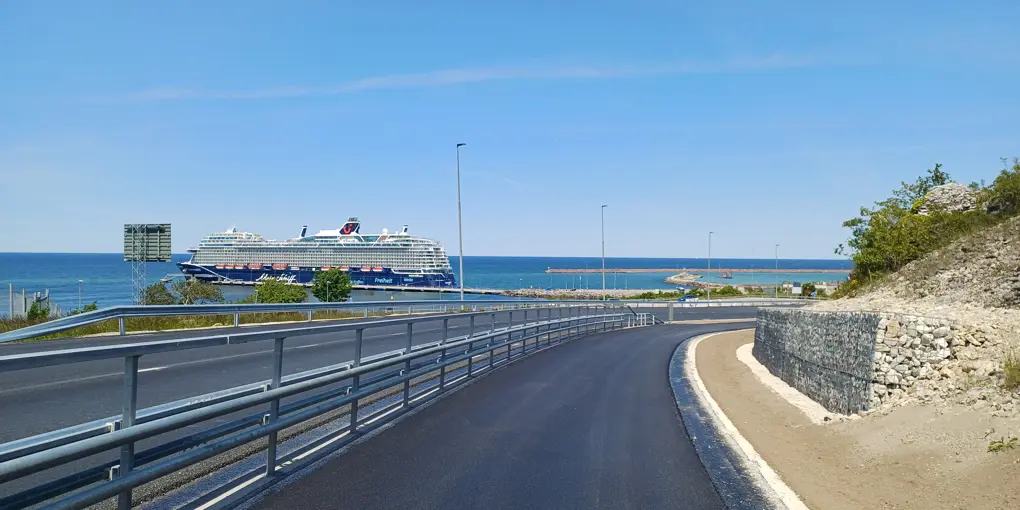 I anslutning till den nya gång- och cykelvägen bygger Region Gotland en gångbro till kryssningskajen för att resenärer som kliver på och av kryssningsfartygen i Visby ska kunna ta sig över färjeleden utan att möta fordonstrafik.