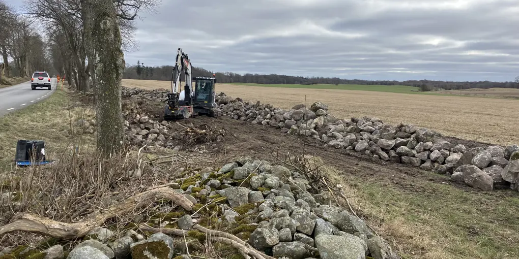Nu börjar arbetet med att renovera stenmuren och plantera ett åttiotal nya träd i allén längs väg 1587 i Tomelilla kommun.