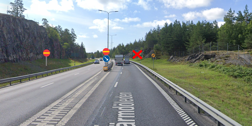 Utöver skyltning har vi genomfört en justering av linjemarkeringen där mittsepareringen börjar vid östra brofästet för att utöka spärrfältet. Vi har också föreslagit en förlängning av gällande omkörningsförbud, vilket Länsstyrelsen i Stockholms län beslutade om i mars. Syftet med de här åtgärderna är att minska risken att bilister av misstag byter körfält innan mittsepareringen börjar och på så vis hamna i motsatt körriktning.