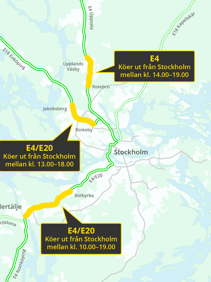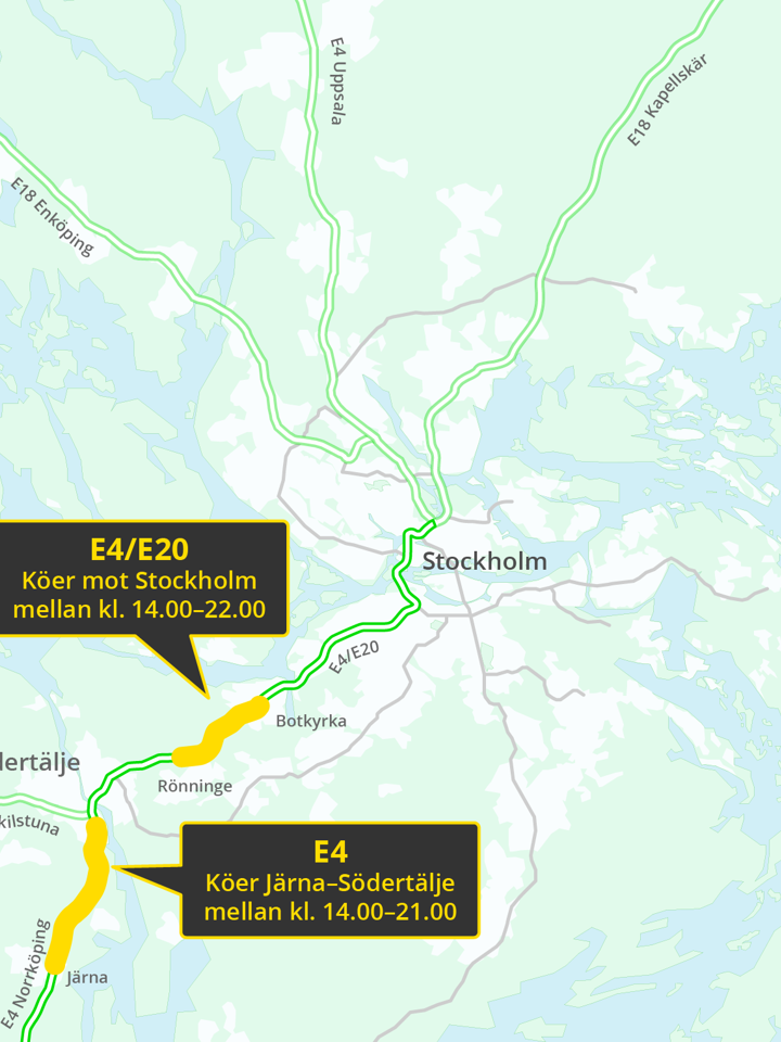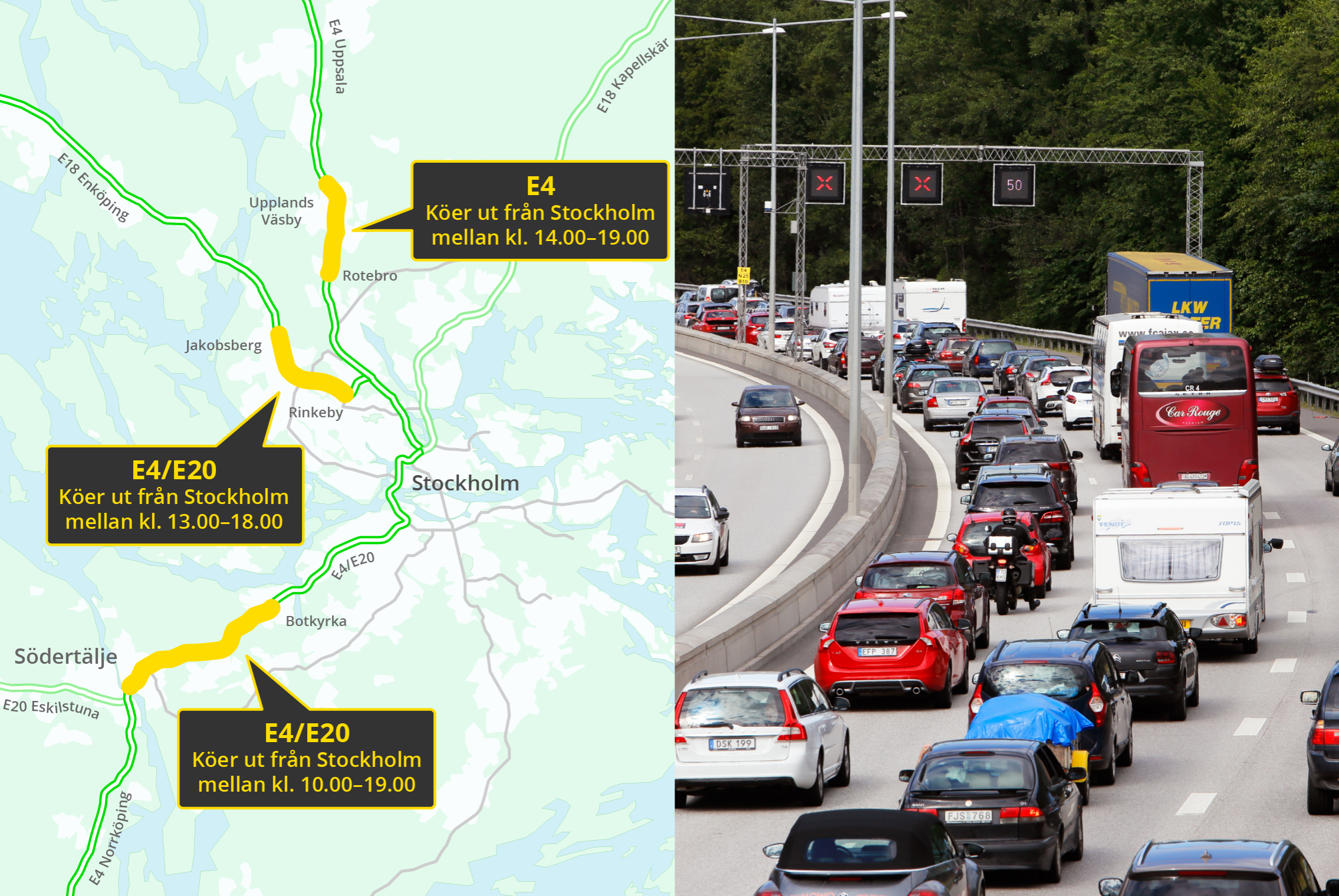 När trafiken intensifieras på vissa sträckor innebär det förlängda restider. Särskilt hårt belastade vägar är E4/E20 Södertäljevägen, E4 mellan Järna och Södertälje, E4 Uppsalavägen och E18 mot Enköping.