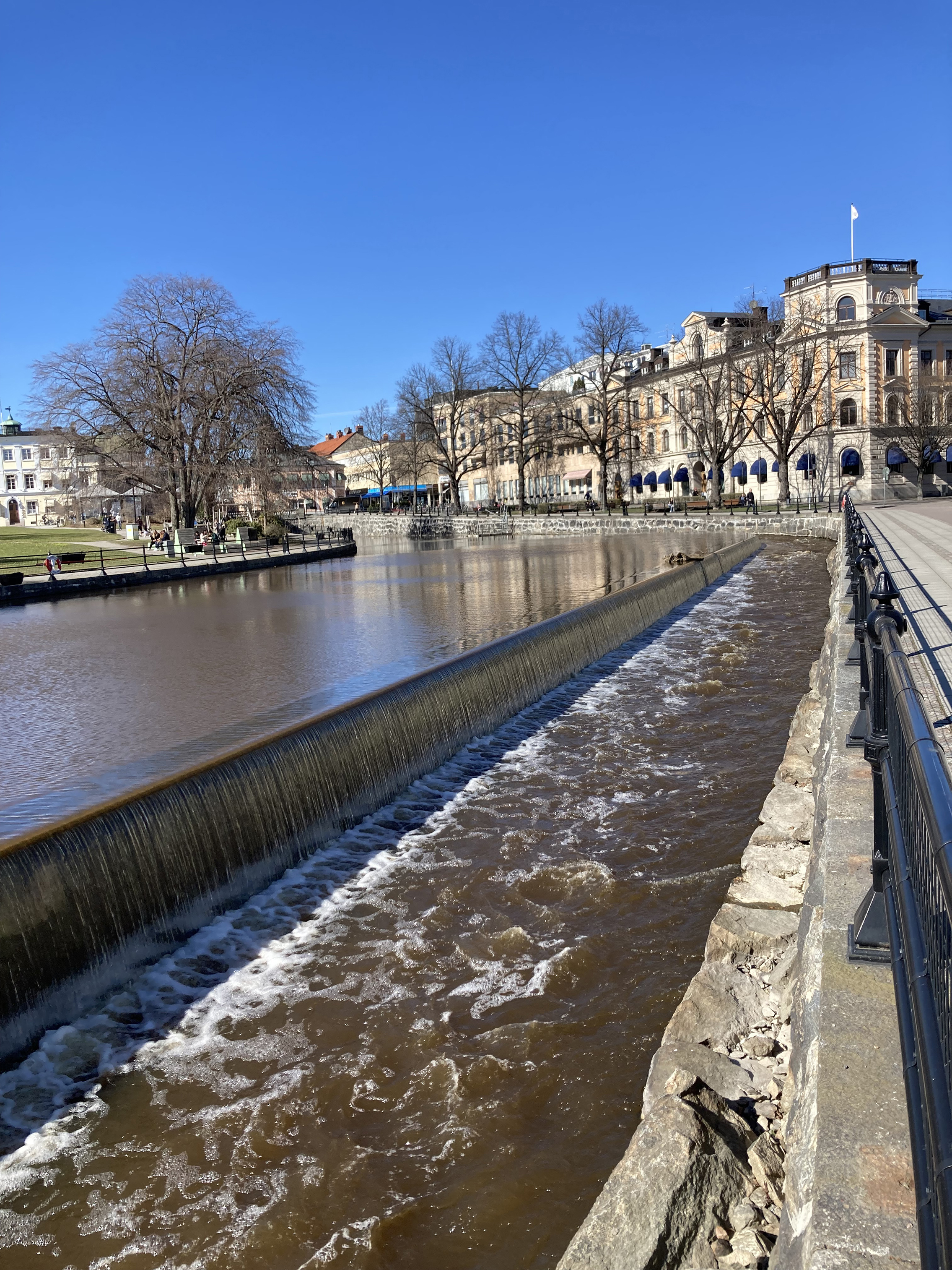 Vid Turbinbron har en ny fördämning längs vattenfåran bevarat dammens karaktäristiska vattenspegel på ena sidan, samtidigt som fiskvandring möjliggörs i forsande vatten på den andra. I mötet mellan nivåerna bildas ett långsträckt vattenfall genom en profilerad stålkant – ett enkelt men effektfullt gestaltningsgrepp. Längs det renoverade gångstråket förstärks upplevelsen av platsen av det stigande bruset från vattnet.