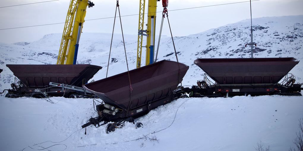 De oskadda malmvagnarna bärgas med hjälp av en kran för att transporteras till Narvik. Fotograf: LKAB