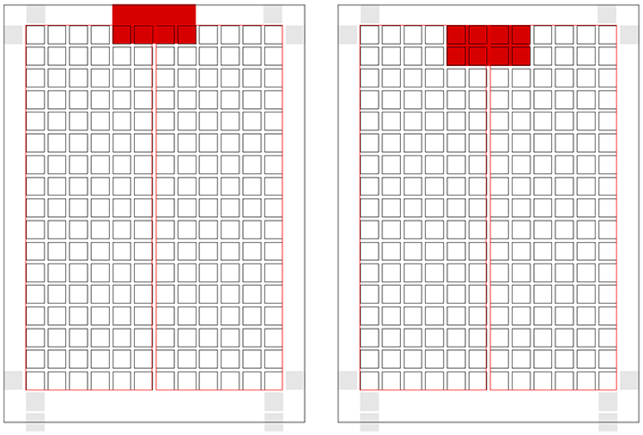 I exemplet ser du hur ett A4 format kan disponeras. Den röda ytan symboliserar vår huvudlogotyp. Den kan placeras på olika sätt i gridsystemet. Exempelvis centrerad, höger- eller vänsterställd.