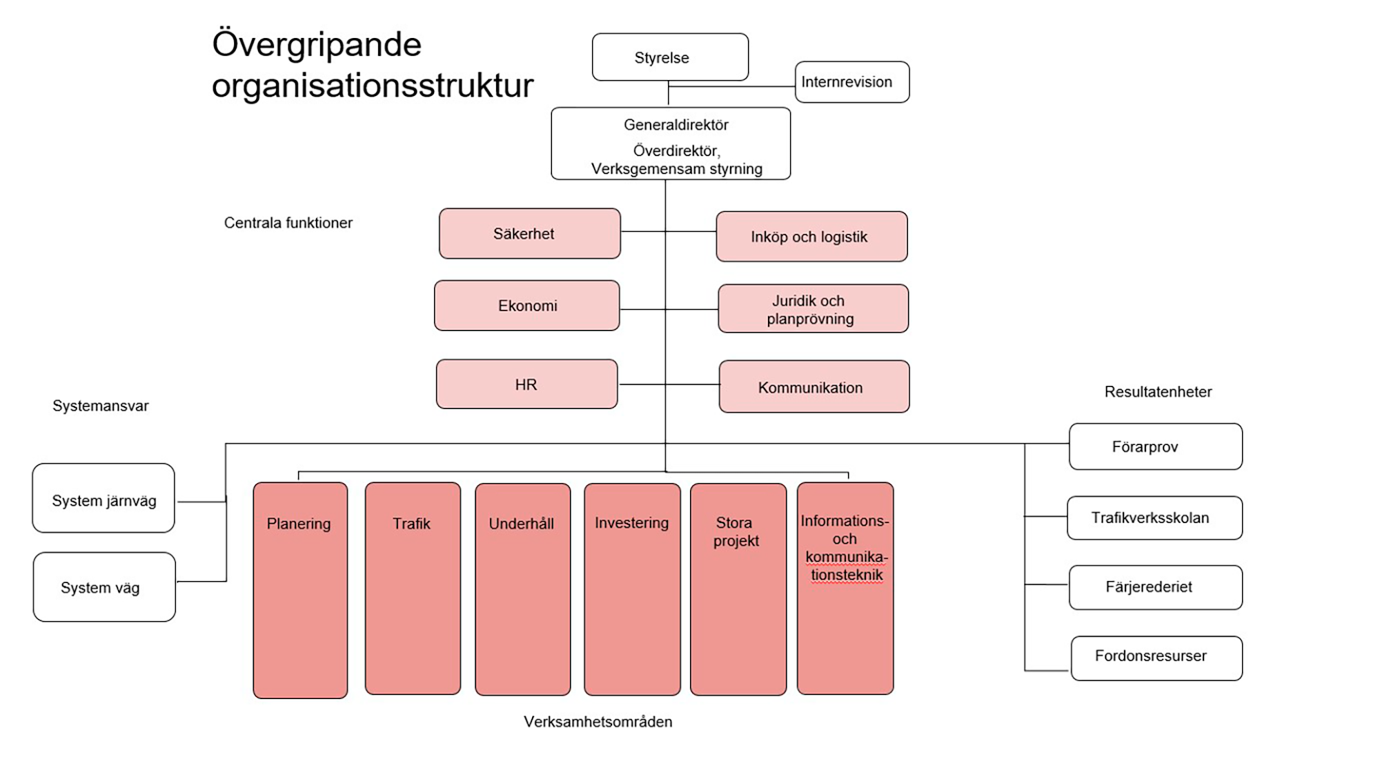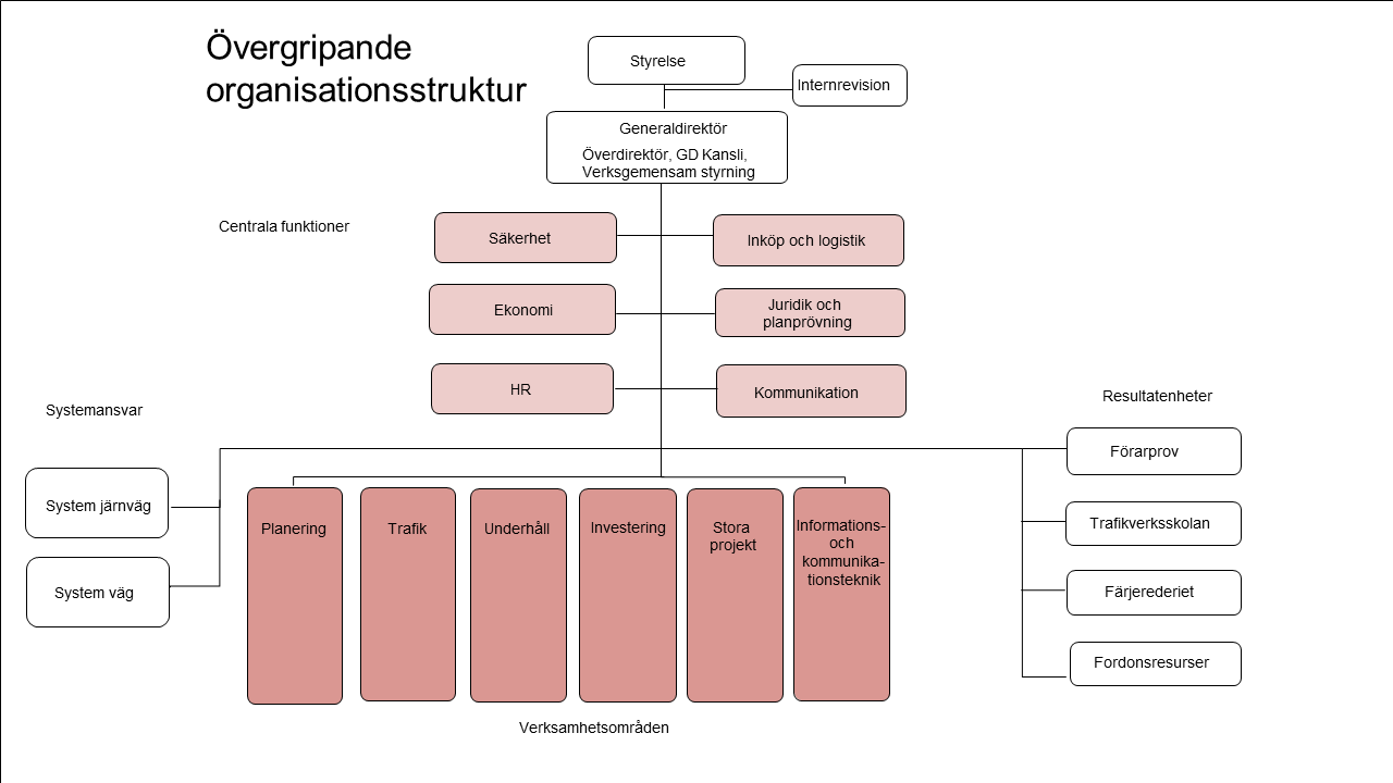 Skissen visar Trafikverkets delar som i texten nedan. Där finns även styrelse, internrevision, generaldirektör, överdirektör, generaldirektörens kansli samt gemensam styrning och systemansvar för järnväg och väg.