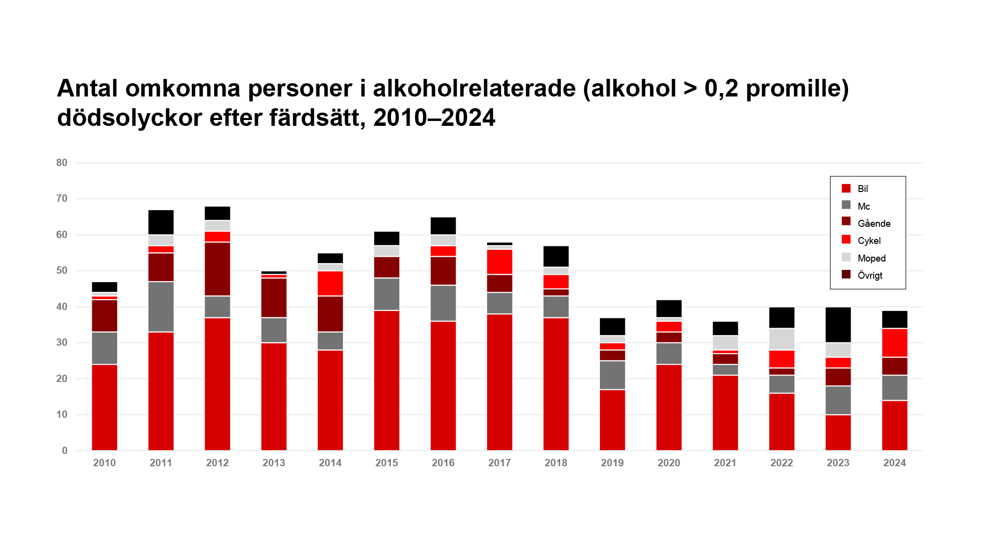 Av de totalt 213 omkomna under 2024 har 18 procent omkommit i en alkoholrelaterad olycka. I absoluta tal innebär det 39 personer (35 alkohol + 4 både alkohol och narkotika).
