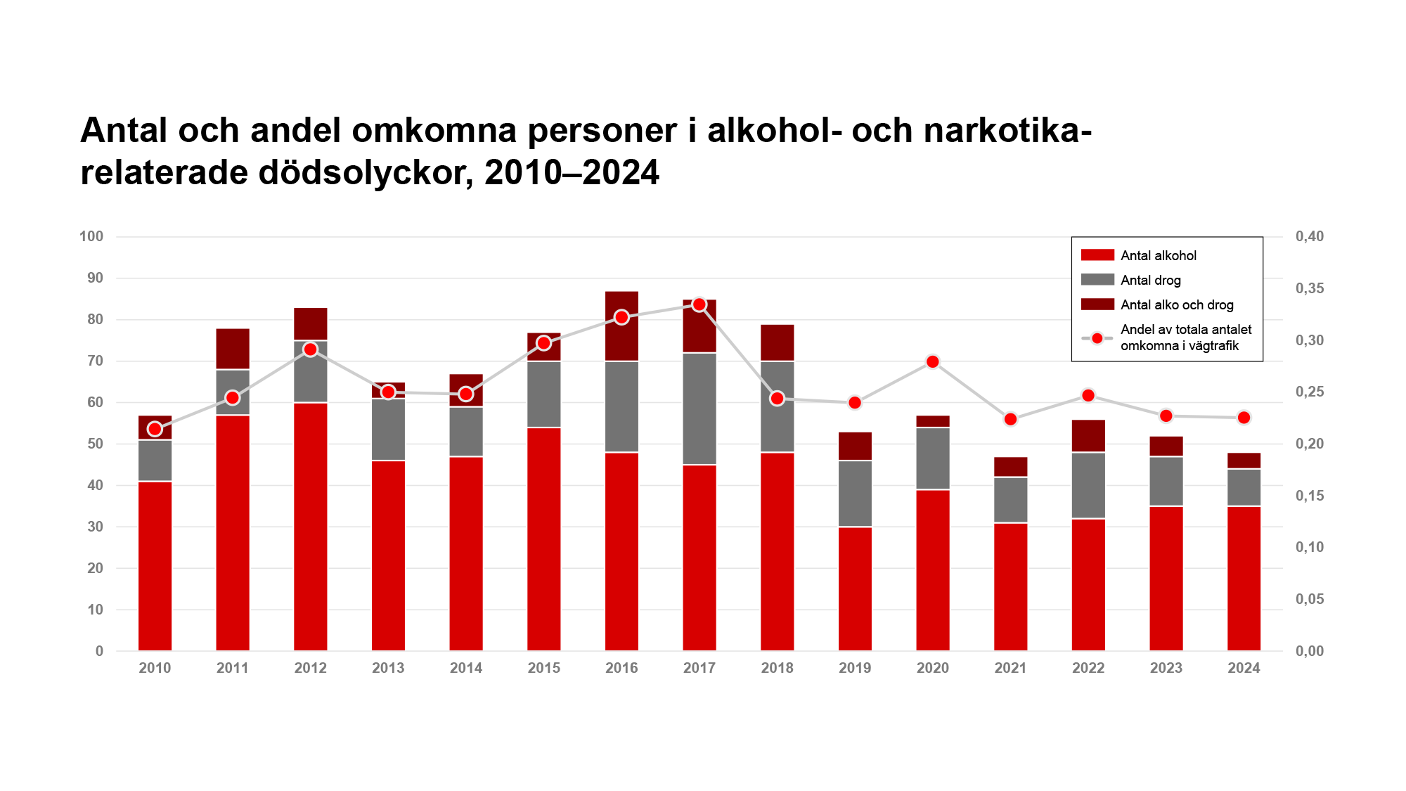 Trafikverkets djupstudier av dödsolyckor visar att 48 personer omkom i en alkohol- eller narkotikarelaterad trafikolycka år 2024, vilket motsvarar 23 procent av alla omkomna i trafiken. Av dessa personer omkom 35 i olyckor som enbart var alkoholrelaterade, 9 i olyckor som enbart var narkotikarelaterade och 4 i olyckor som var både alkohol- och narkotikarelaterade.