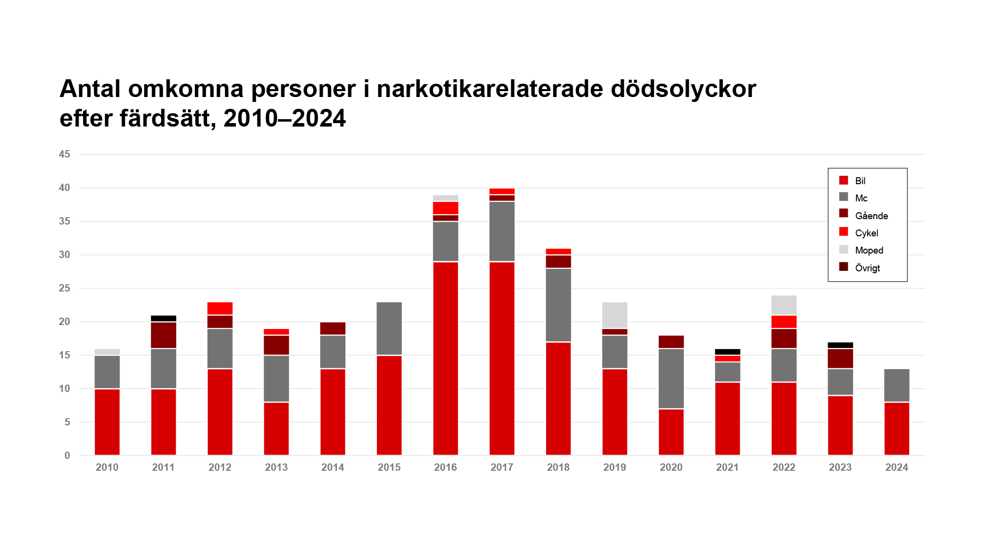 Under 2024 omkom 13 personer (9 narkotika + 4 både alkohol och narkotika) i narkotikarelaterade olyckor, vilket är fyra personer färre än år 2023. Mellan 2015 och 2017 skedde en kraftig ökning av antal omkomna i drogrelaterade olyckor, från 23 till 40 personer. Därefter har en minskning skett till ungefär samma nivå som tidigare år.