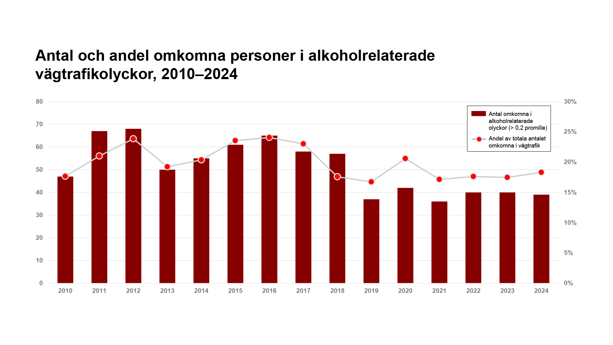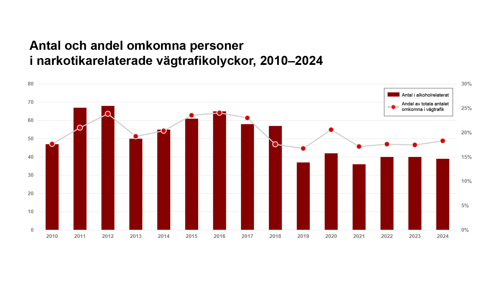 År 2024 omkom 213 personer i vägtrafiken vilket är 16 färre än året innan då 229 personer omkom. Antalet omkomna i alkohol- och narkotikarelaterade olyckor har minskat med fyra personer 2024 jämfört med 2023, men andelen utgör fortfarande 23 procent av det totala antalet omkomna. Sett över en längre period har antalet omkomna i alkoholrelaterade olyckor minskat medan antalet narkotikarelaterade dödsfall nu är tillbaka på ungefär samma antal som i början av perioden, efter några år av relativt höga värden.