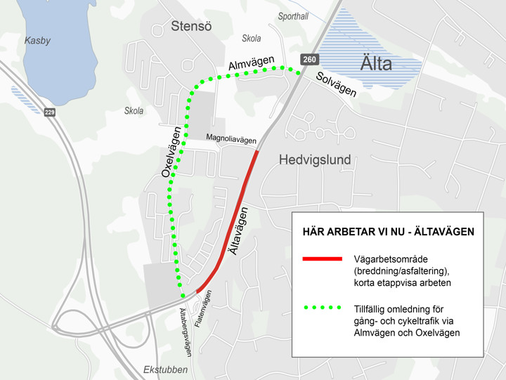 Arbetet längs Ältavägen kommer att pågå fram till vintern 2026, om allt går enligt plan. Under byggtiden kommer framkomligheten på väg 260 Ältavägen periodvis att vara begränsad. Upprustningsarbetet sker i kortare etapper, där ett körfält kan komma att stängas av under kortare enstaka perioder. Trafiken regleras i så fall med tillfälliga trafikssignaler förbi arbetsområdet. Vi arbetar oss fram på det här sättet för att minska påverkan på trafiken så mycket vi kan. För fotgängare, cyklister och andra oskyddade trafikanter kommer det att under byggtiden bli aktuellt med både omledning och i vissa fall en smalare gång- och cykelväg.