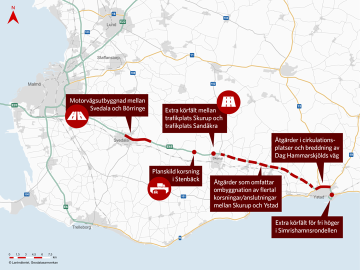 Trafikverkets har identifierat behov av ett extra körfält mellan trafikplats Skurup och trafikplats Sandåkra i riktning mot Ystad. Det innebär även att berörda korsningar behöver byggas om för att anpassas för det nya körfältet, så som ombyggnation av trafikplats Sandåkra där det behövs accelerations- och retardationskörfält. Åtgärderna kommer leda till ökad framkomlighet och förbättrad trafiksäkerhet.