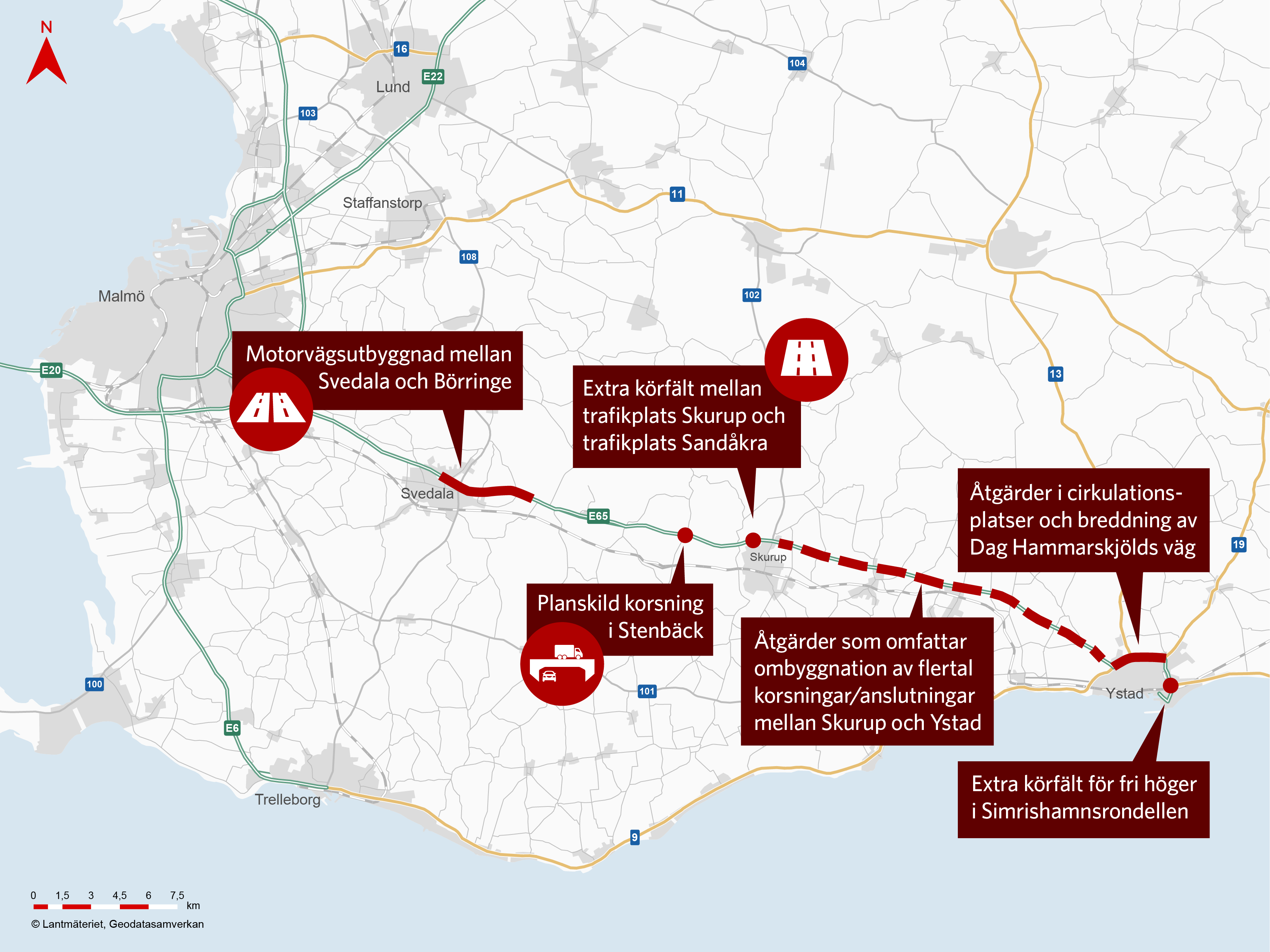 Kartan visar ett urval av planerade åtgärder på E65 genom Skåne.