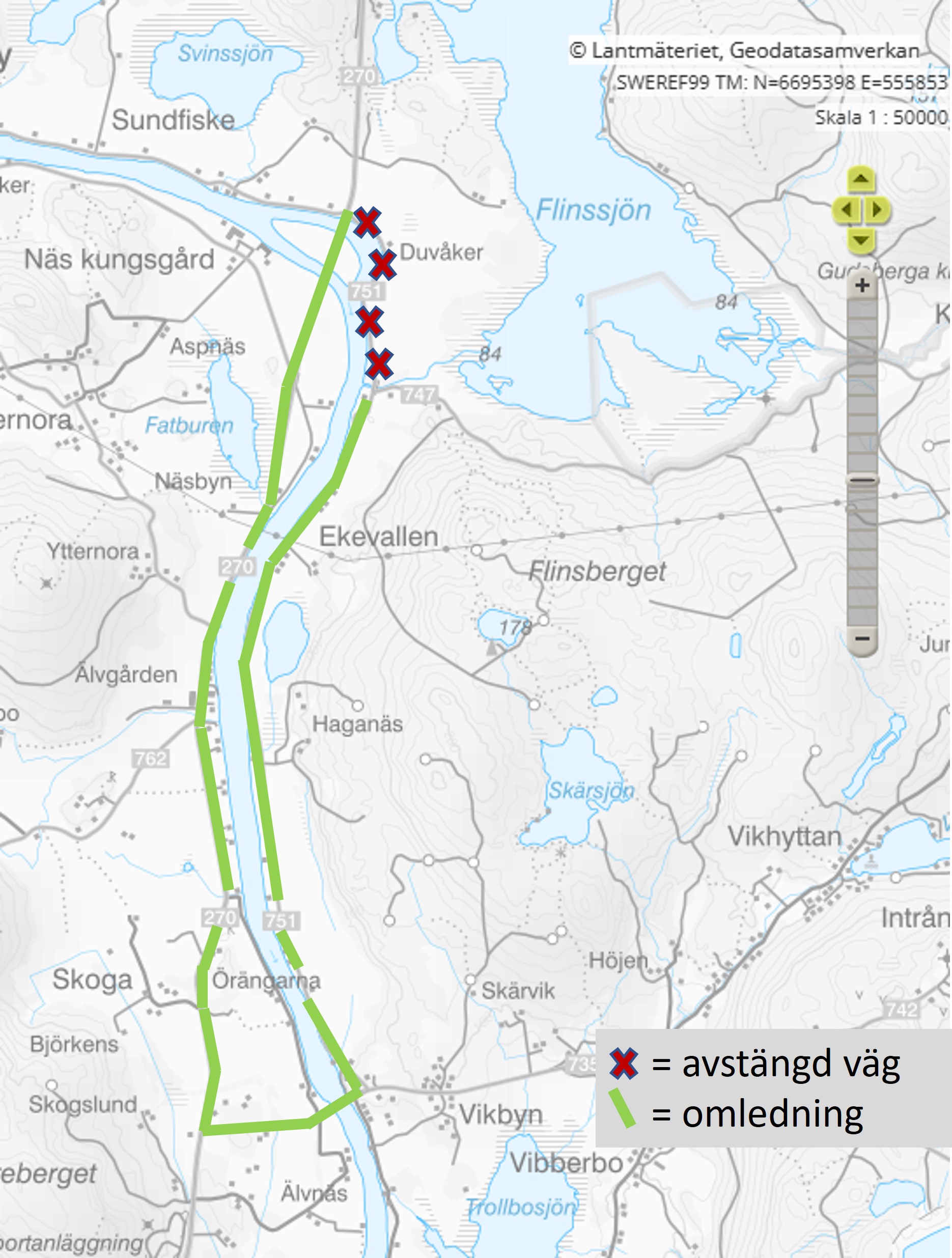 Avstängningen gäller från måndag den 4 maj till mitten av juni. Under perioden leds all trafik om via väg 270 och 735, se karta.