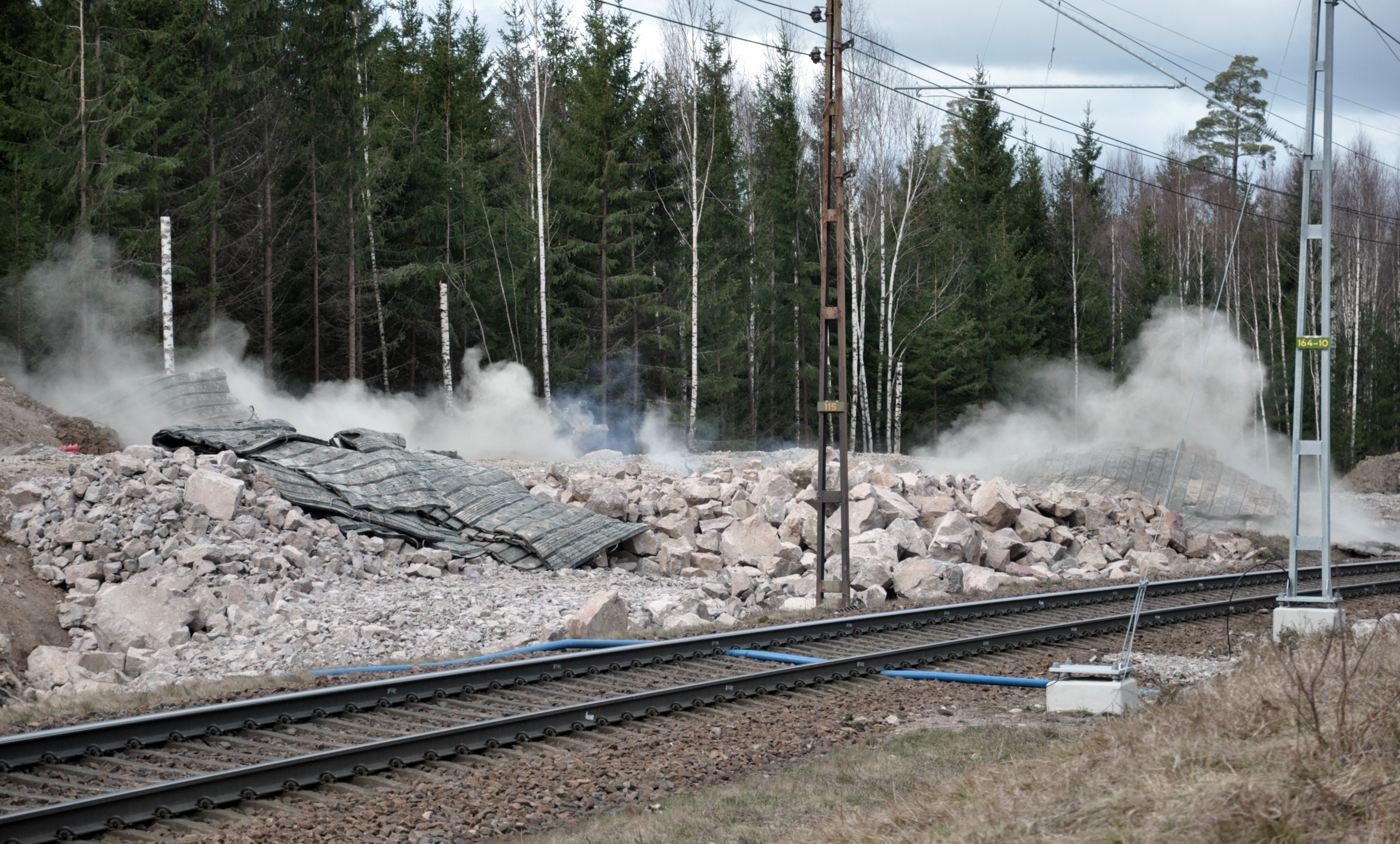 Varningstutan ljuder. Några sekunder senare hörs den dova knallen och ett antal ton berg lösgörs för att bereda plats för det nya dubbelspåret mellan Avesta Krylbo station och Dalslund i södra delen av Dalarna.