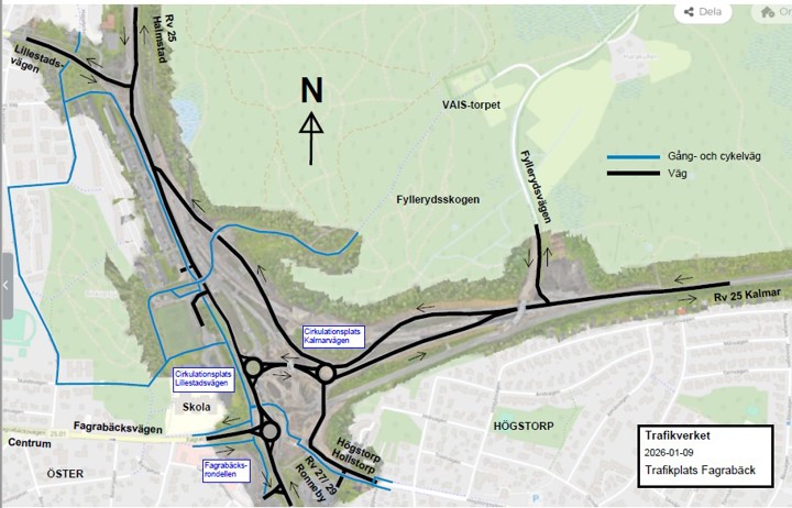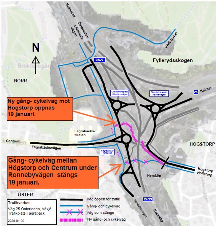 Trafikverket bygger tillsammans med Växjö kommun en ny trafikplats vid Fagrabäck och en ombyggnation av Österleden. Detta gör vi för att din resa till, från och genom Växjö ska bli säkrare och smidigare.