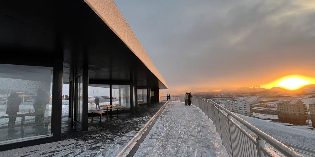 Placeringen av rastplatsen vid foten av Luossavaara skidbacke bjuder på en enastående utsikt mot fjällvärlden. Till en början satte vädret stopp för utsikten under lördagen, men allteftersom sprack himlen upp. Kebnekaise och andra fjälltoppar kunde uppenbara sig och en eldröd sol visade sig över Kirunavaaragruvan.