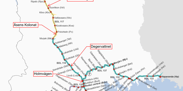 Befintliga plankorsningar vid Särkirovavägen, Åsens Kolonat, Degervattnet, Holmvägen, Björkliden och Krokvik ska byggas om och få vägskydd i form av helbomsanläggning samt ljud- och ljussignaler. Särkirovavägen ligger i Gällivare kommun, Åsens Kolonat ligger i Jokkmokks kommun, Degervattnet och Holmvägen ligger båda i Bodens kommun.