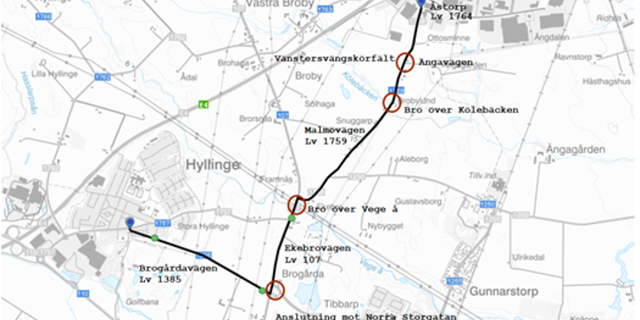 Vi planerar att bygga en cirka 4,5 km lång ny gång- och cykelväg mellan Bjuv, Hyllinge och Åstorp och bygga om korsningen Malmövägen/Ängavägen.