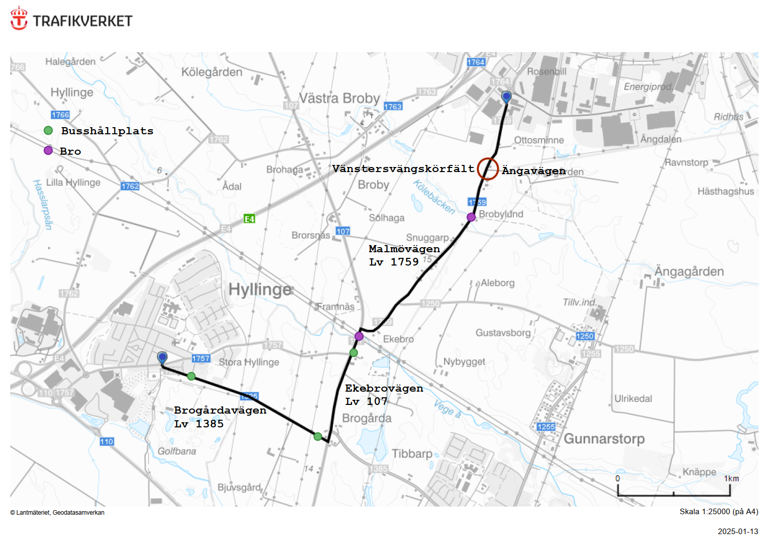 - Befintlig gång- och cykelväg strax väster om korsningen där Brogårdavägen (väg 1385) möter Åstorpsvägen (väg 1757).