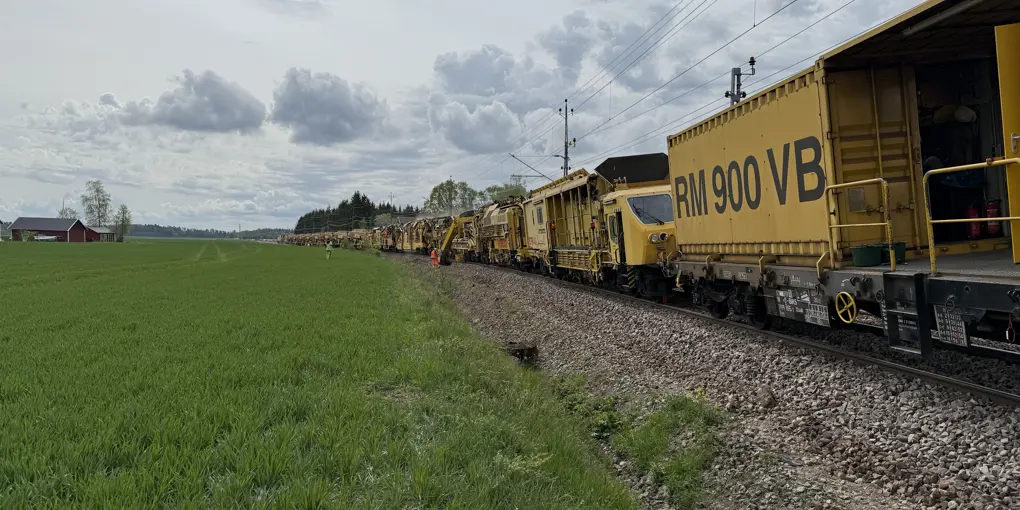 För att göra arbetet så effektivt som möjligt använder vi maskiner i långa tåg. Stora mängder jordmassor, grusmassor och järnvägsmaterial kommer att hanteras på några ställen längs sträckan.