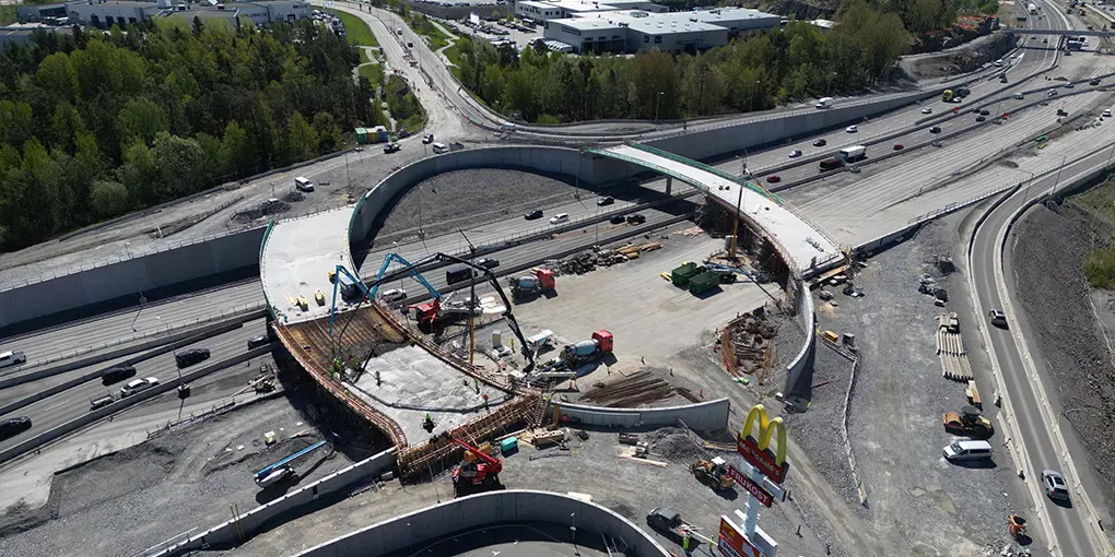Vi arbetar vidare med den nya trafikplatsen Lindvreten södra och vägarna i Vårby backe. Båda broarna i trafikplats Lindvreten södra är gjutna och vi arbetar bland annat med betongarbeten, tätskikt, beläggning och räcken.