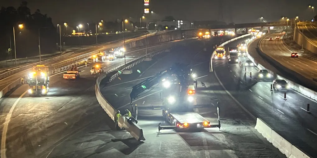 Natten mellan fredagen den 11 oktober och lördagen den 12 oktober flyttar vi trafiken i sidled på E4/E20 i södergående riktning mellan Vårby backe och Kungens kurva. Vi flyttar vägbanan längre till höger.