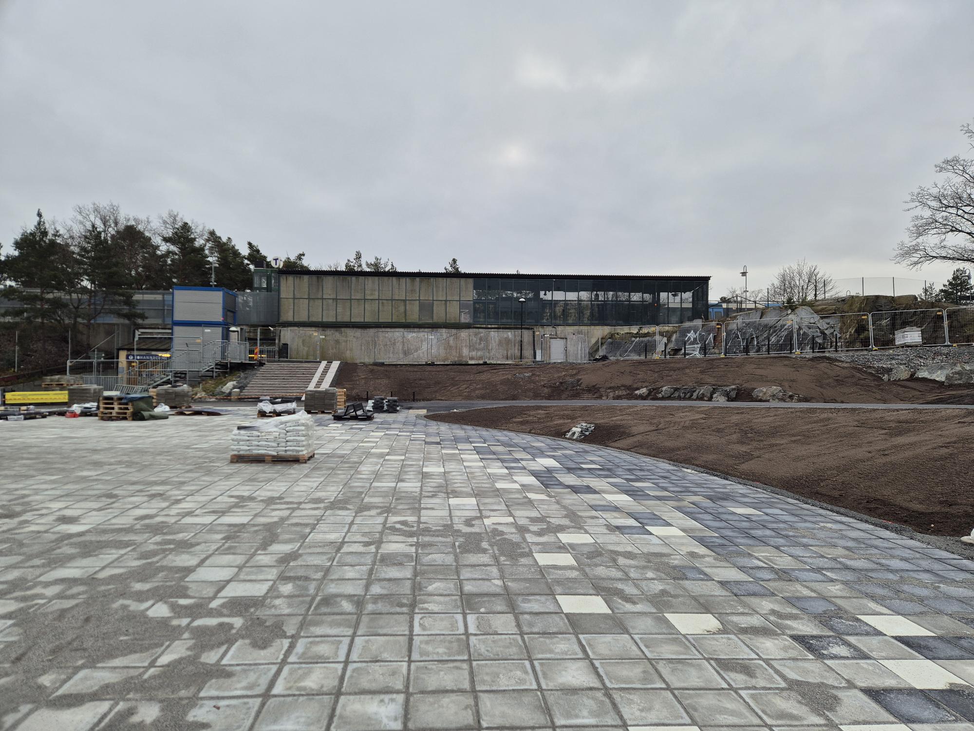 Vi har knackat och sprängt bort berg för att öppna upp ytan, byggt upp stödmurar längs den nya gång- och cykelvägen som kommer ta dig ner till Bergslagsvägen. Påbörjat asfalteringen, lagt stenplattor i fint mönster på den öppna ytan och byggt nya trappor.