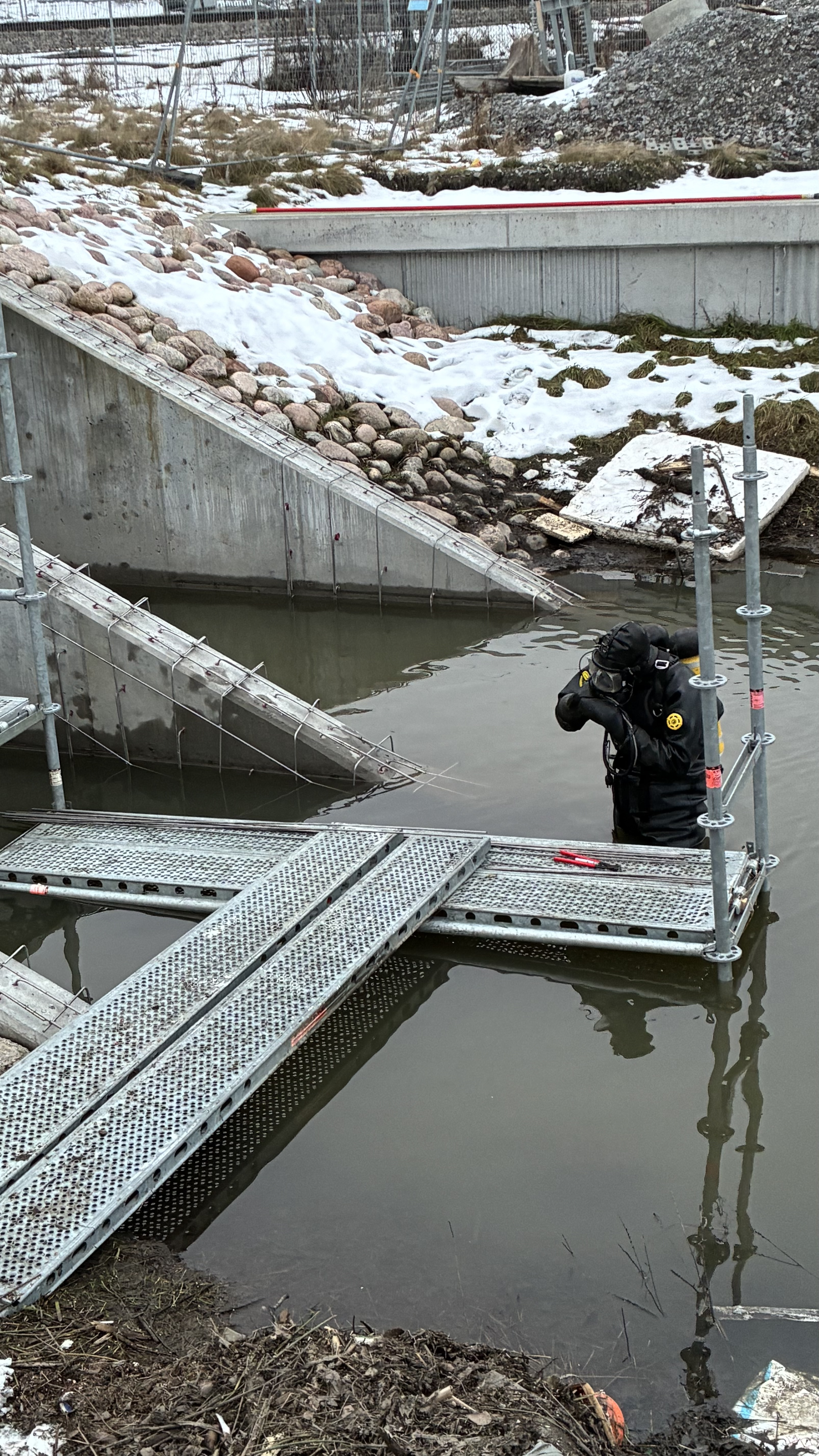 Det är inte varje dag man ser dykare på våra arbetsplatser! I Spånga pågår ett reparationsarbete där en skadad dagvattenkulvert lagas under vatten med hjälp av dykare och specialutvecklad undervattensbetong.