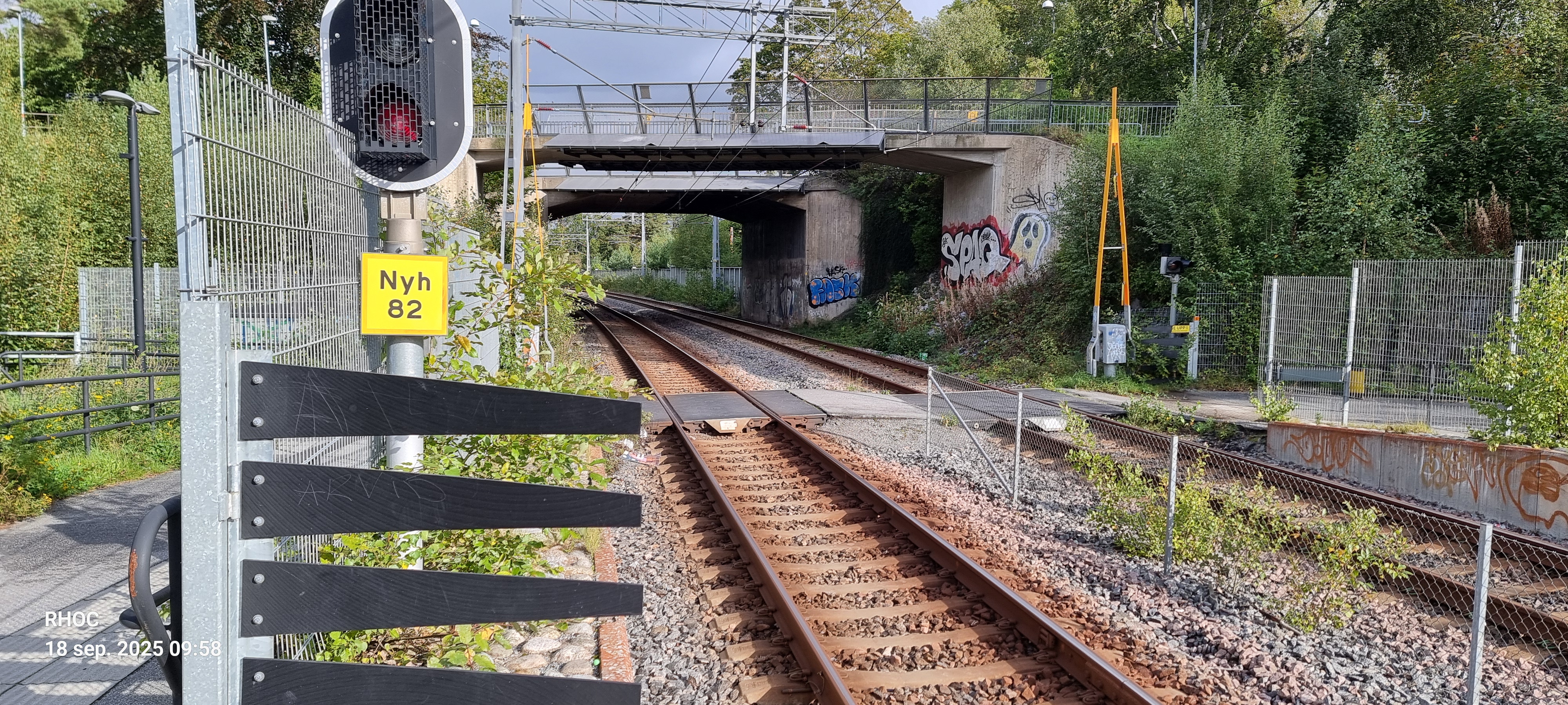 Från och med vecka 5 2026 påbörjas arbetet med att stängsla passagerna in på vardera sida av den norra plattformen. För att ta sig säkert över järnvägen hänvisar vi till gång- och cykelvägen vid Nynäsvägen. Vi stängslar in passagerna för att minska risken för spårspring och olyckor med tågen.