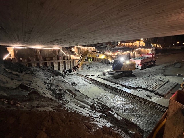December månad handlade mycket om spontning, schaktarbeten, grävning och gjutning. Nu pausar vi bygget för ett par veckors julledighet med ljuset synligt i passagerna.