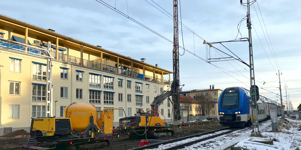 Vecka 2 2025 påbörjades arbetet med att sätta kalkcementpelare i marken under järnvägen. Pelarna är gjorda av ett miljövänligare cement som tillverkas av slaggprodukter och minskar koldioxidavtrycket då går det åt mindre energi i tillverkningen. Tidigare under hösten 2024 provborrade vi på Uppsala kommuns mark intill järnvägen med goda resultat. När kalkcementpelarna är i marken ska vibrationerna från tågtrafiken dämpas, bland annat för att minska påverkan på människor som bor och vistas i området.