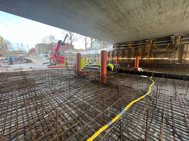 Just nu pågår ett intensivt arbete med att bygga formar och gjuta golv, väggar och tak i båda passagerna. Arbetet sker parallellt och omfattar flera tidskrävande moment. Bland annat byggs gjutformar, armering läggs, ledningar gjuts in och dagvattenbrunnar monteras. Gjutningen sker i etapper eftersom konstruktionen inte kan gjutas i ett enda stycke.