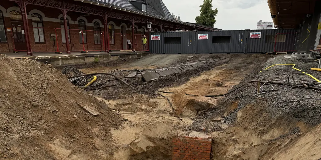 Vi hittar en del intressanta saker när vi bygger om spårområdet på Karlstad C. Nyligen grävde vi fram en plint av tegel och en rad stenblock, delar av den gamla banhallen som tidigare var sammanbyggd med stationshuset.