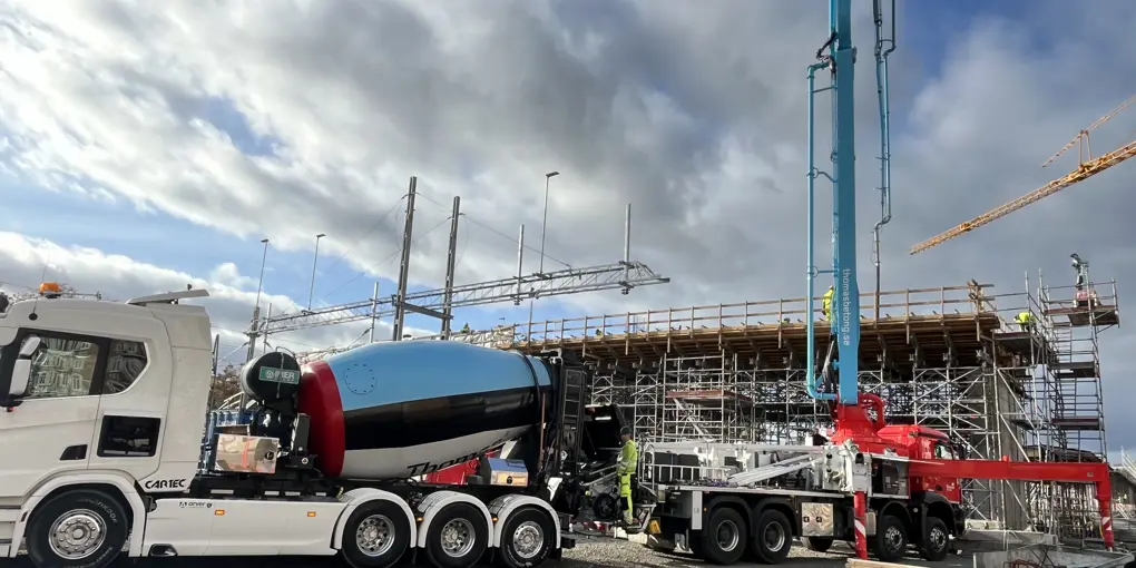 När vi bygger på Karlstads centralstation försöket vi så långt det är möjligt att använda oss av innovativ byggteknik. Det gör vi för att kunna arbeta effektivare, mer hållbart och för att minska bullret på byggarbetsplatsen. Ett exempel på detta är den betongpump med hybridteknik, som vi använder när vi gjuter den sista delen av Trädgårdslänken och den nya Vikenpassagen.