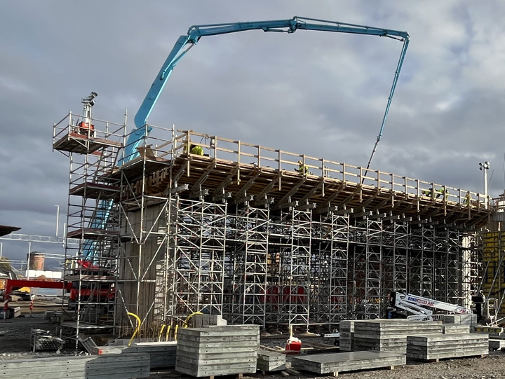 Här gjuts den norra delen av den nya gångbron Trädgårdslänken. Hybridpumpen, med eldrift, har lång räckvidd och bullrar betydligt mindre än en traditionell betongpump.