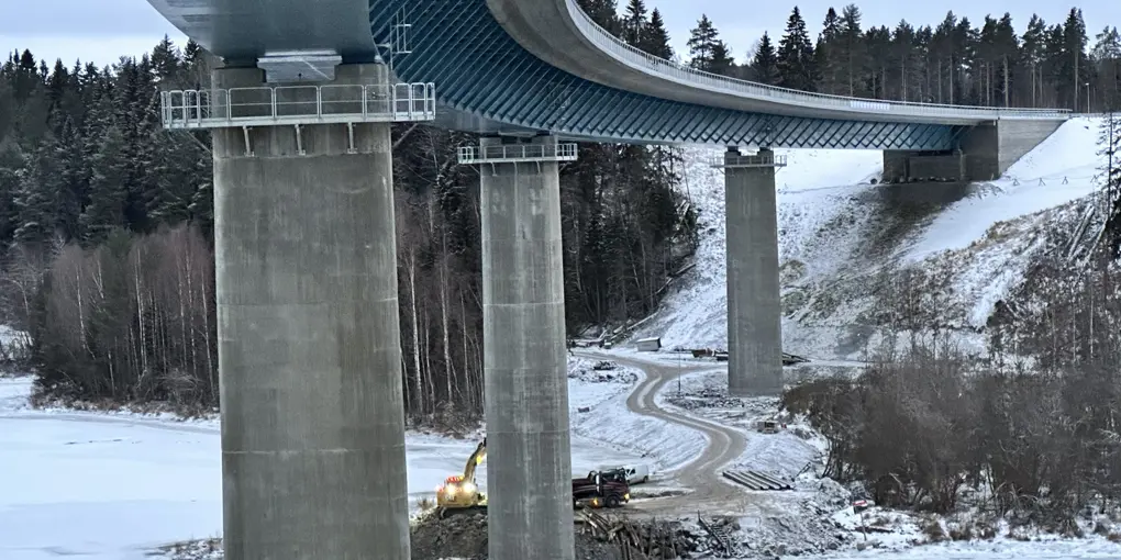Tätskikt och gjutasfalt är lagt på bron, men tyvärr satte kylan stopp för asfaltering av bron innan vintern. Det måste vara minst 5 plusgrader för att det ska fungera att lägga asfalt. I själva brobalken är det stora ytor som målats, inspektionsplattformar har byggts vid brostöden. Om du står på Baggböleören så ser du dem – de har gallergolv och stegar från brobalken. Om du vill titta på bron så rekommenderar vi att du står på Baggböleören, då befinner du dig utanför arbetsområdet.