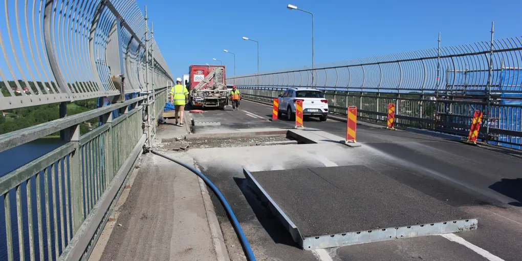 Nu när arbetet med de två första övergångarna är klart kan vi gå vidare med andra arbeten som går att utföra på kvällar och nätter. Kommande veckor ska vi byta övergångskonstruktioner, gjuta igen skador och göra ett kortare beläggningsarbete. Samtidigt som dessa arbeten pågår uppe på bron kommer vi att göra betongreparationer inuti bron genom en lucka i körbanan som vi sen ska gjuta igen. Allt arbete kommer att ske vardagar, måndag-torsdag, klockan 19:00-06:00.