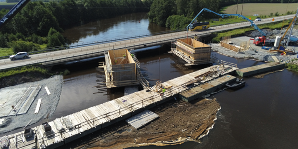 Den nya bron över Kolbäcksån uppförs likt den gamla, med två brostöd i vattnet.