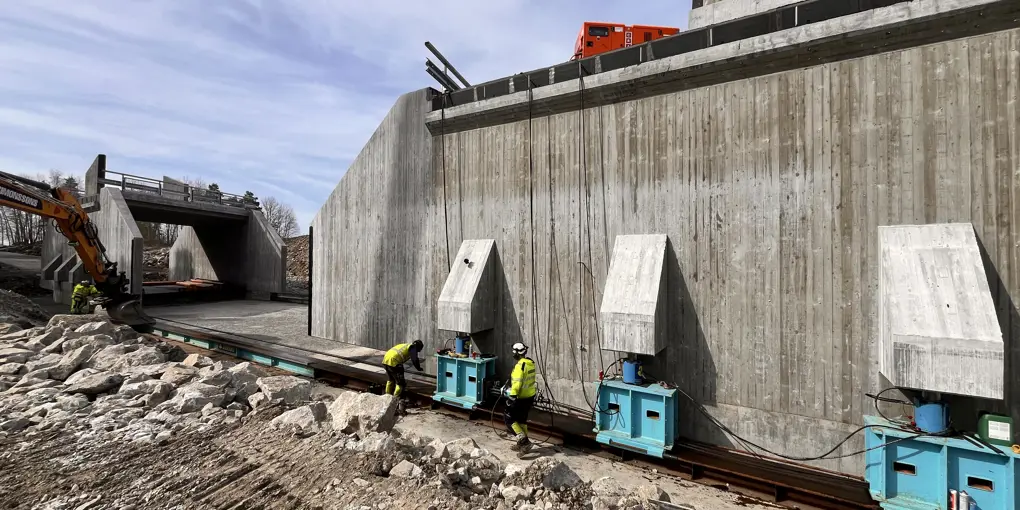 - Sen placerade vi ut balkar som bron gled på och vid de så kallade lyftklackarna på bron monterade vi hydrauliska domkrafter som lyfte upp den. Bron drogs på plats centimeter för centimeter med hjälp av vajrar, först den ena bron och sen upprepades processen med den andra bron.
