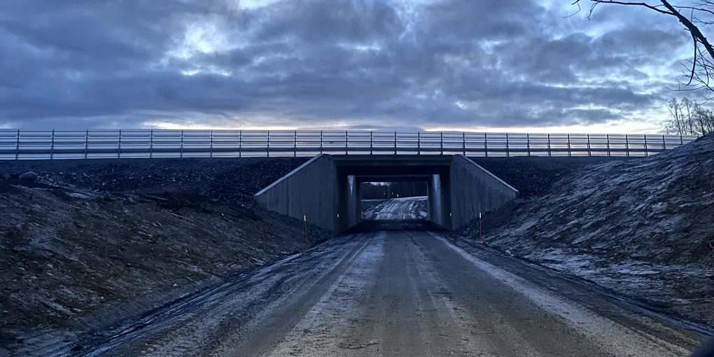 Nu kan du passera under E18 på väg 608 (Odensvivägen) igen. Vi stängde passagen under E18 för att kunna ha en förbiledning av E18-trafiken när vi byggde två broar.