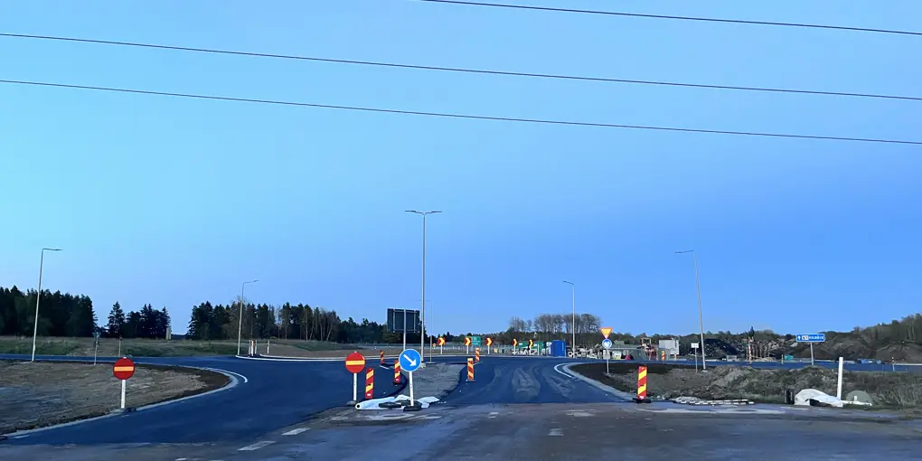 Trafikplatsen är inte helt klar utan det kvarstår vissa arbeten med räcken, asfaltering, skyltar, belysning samt arbeten med refuger. Vi kommer att asfaltera trafikplatsen under juni.