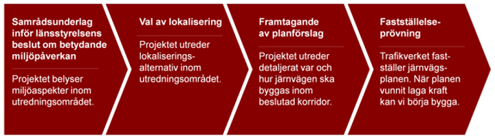 När vi ska planera en ny järnväg inleder vi en planläggningsprocess som regleras av lagen om byggande av järnväg. I processen tar vi fram en järnvägsplan, som visar var och hur järnvägen ska byggas. Det är en demokratisk process som är viktig och måste få ta tid. I planeringen ingår olika skeden för att ge goda möjligheter till insyn och möjlighet att framföra synpunkter flera gånger.