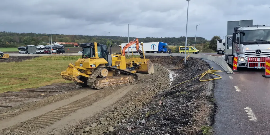 Dubbla körfält anläggs genom rondellen. Åtgärder för bättre framkomlighet i rondellen - körfält breddas och rätas ut, belysningsstolpar flyttas, ny vägvisning i asfalten målas. Justering av räcke, stängsel och portaler. Påbörjas onsdag 15 november och beräknas klart måndag v 48.