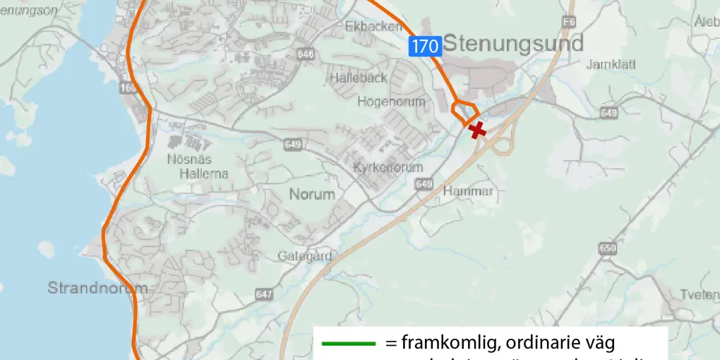 För att kunna utföra dessa arbeten effektivt och säkert behöver vi stänga E6 mellan trafikplats 91 Stenungsundsmotet och trafikplats 90 Stora Höga. Brukar du köra där måste du köra via väg 170, 770 och 160. De vägarna är valda för att de ger kortast omledning, det är få som störs, de har hyfsat god framkomlighet och inga inga höjd- eller bärighetsbegränsningar. Det kan dock uppstå köer så överväg om du måste köra just den natten.