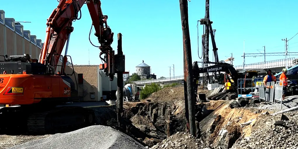 En imponerande mängd pålar av kalkcement och stål har slagits ner i leran, ibland så djupt som 140 meter. För att stödja marken och tågens belastning har vi förstärkt marken noggrant. I vissa delar där spår har flyttats eller rivits, fanns det gamla träpålar från 50-talet som nu måste dras upp och ersättas med kalkcementpelare. Efter uppdragningen transporteras träpålarna bort för deponering. Att dra upp sådana pålar ur leran kräver rätt utrustning och expertis för att utföras säkert och effektivt, utan att skada omgivande miljö eller infrastruktur. Grävmaskiner används med specialutrustning som klämfästen eller gripare för att applicera lyft- och dragkraft och extrahera pålar.